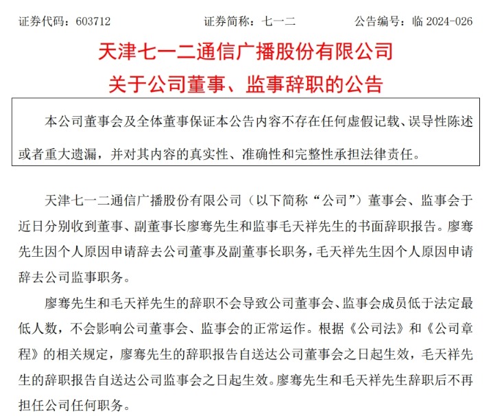 廖骞因个人原因申请辞去七一二董事、副董事长职务,毛天祥因个人原因申请辞去七一二监事职务。