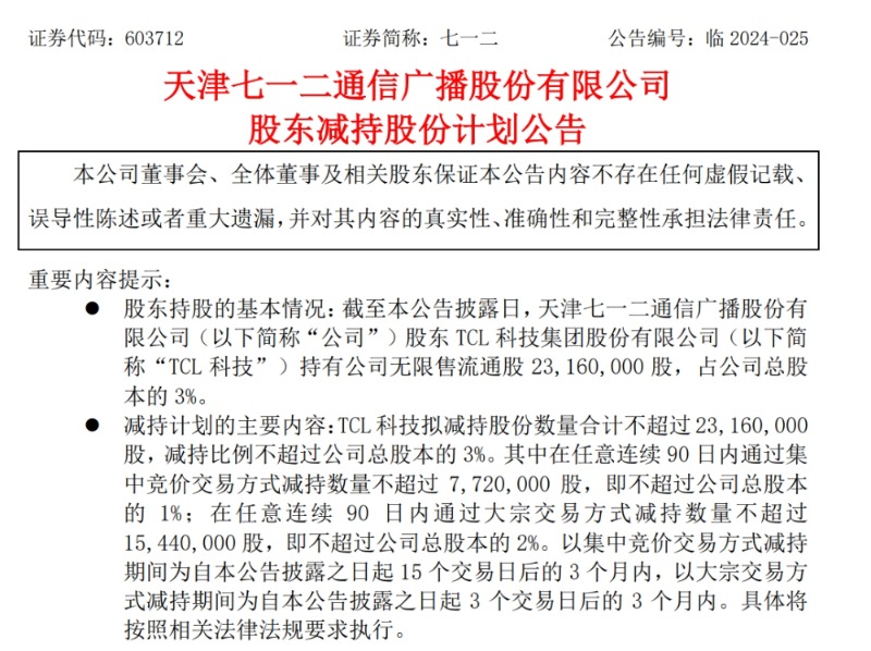 公告显示,截至本公告披露日,TCL科技持有七一二总股本的3%。计划90日内通过集中竞价交易方式减持不超过公司总股本的1%;90日内通过大宗交易方式减持数量不超过总股本的2%。